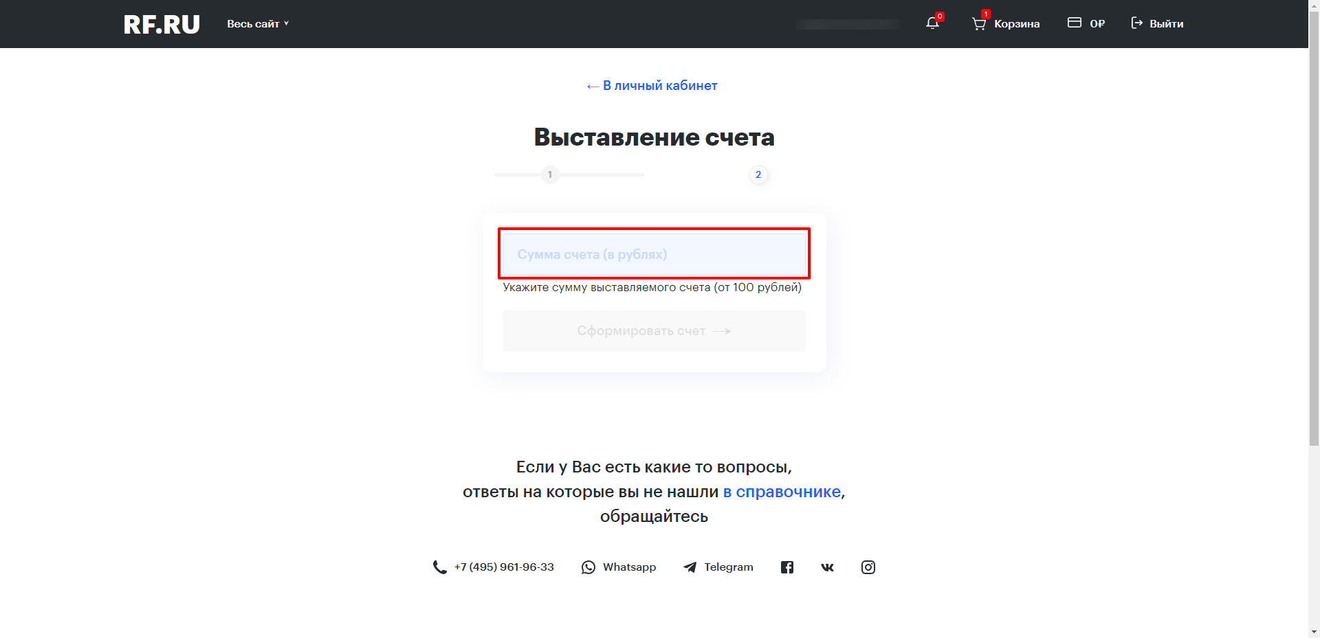 - На странице второго шага укажите сумму счета в рублях в поле ввода (не менее 100 рублей).