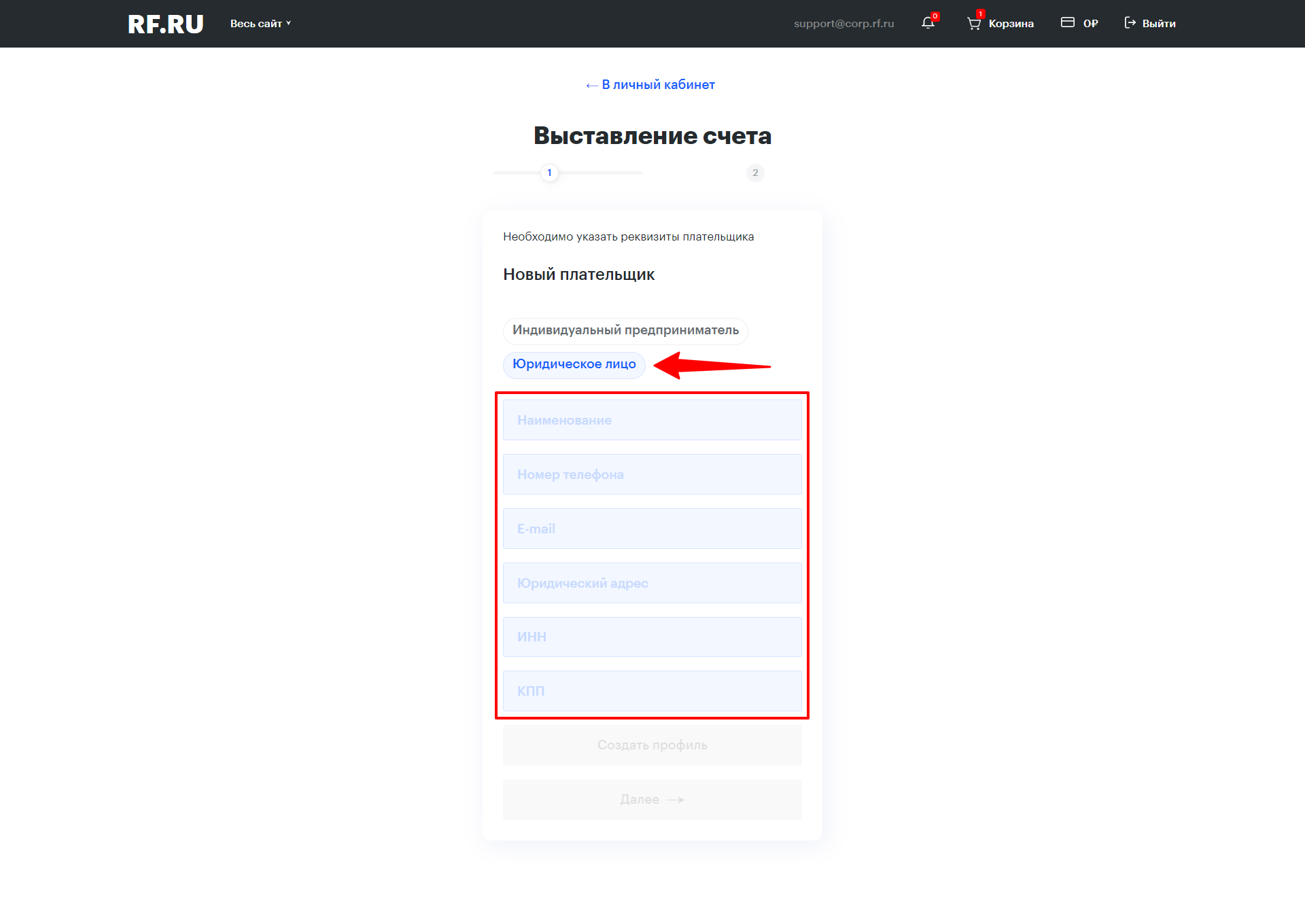 - Страница перезагрузится и вы увидите только что созданный профиль в выпадающем списке Выберите плательщика - чтобы развернуть его нажмите на строку с именем профиля (если ранее вы создавали другие профили для безналичной оплаты, они также отобразятся в выпадающем списке). Нажмите кнопку Далее.