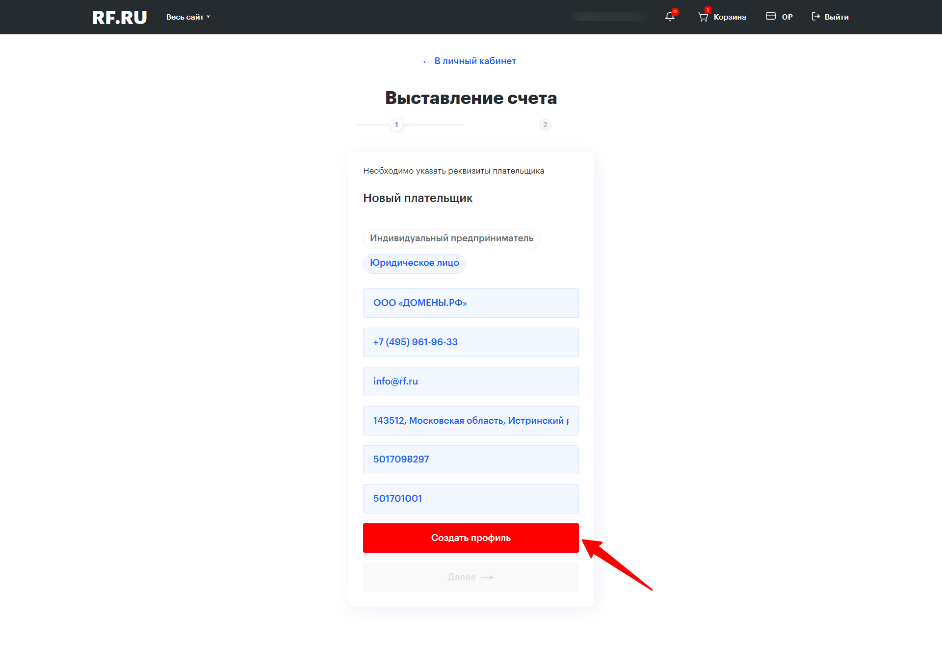 - Проверьте корректность внесенных данных и нажмите кнопку Создать профиль.