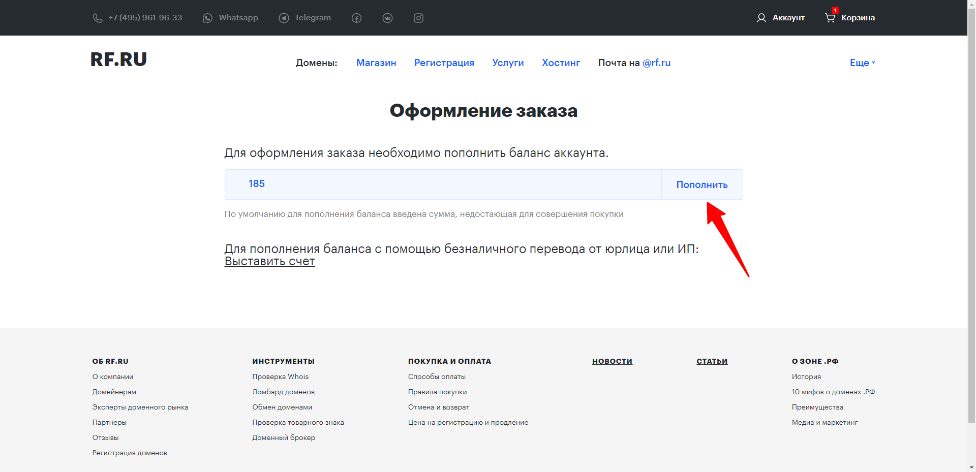 - Если вы оплачиваете заказ как физическое лицо, нажмите кнопку Пополнить.