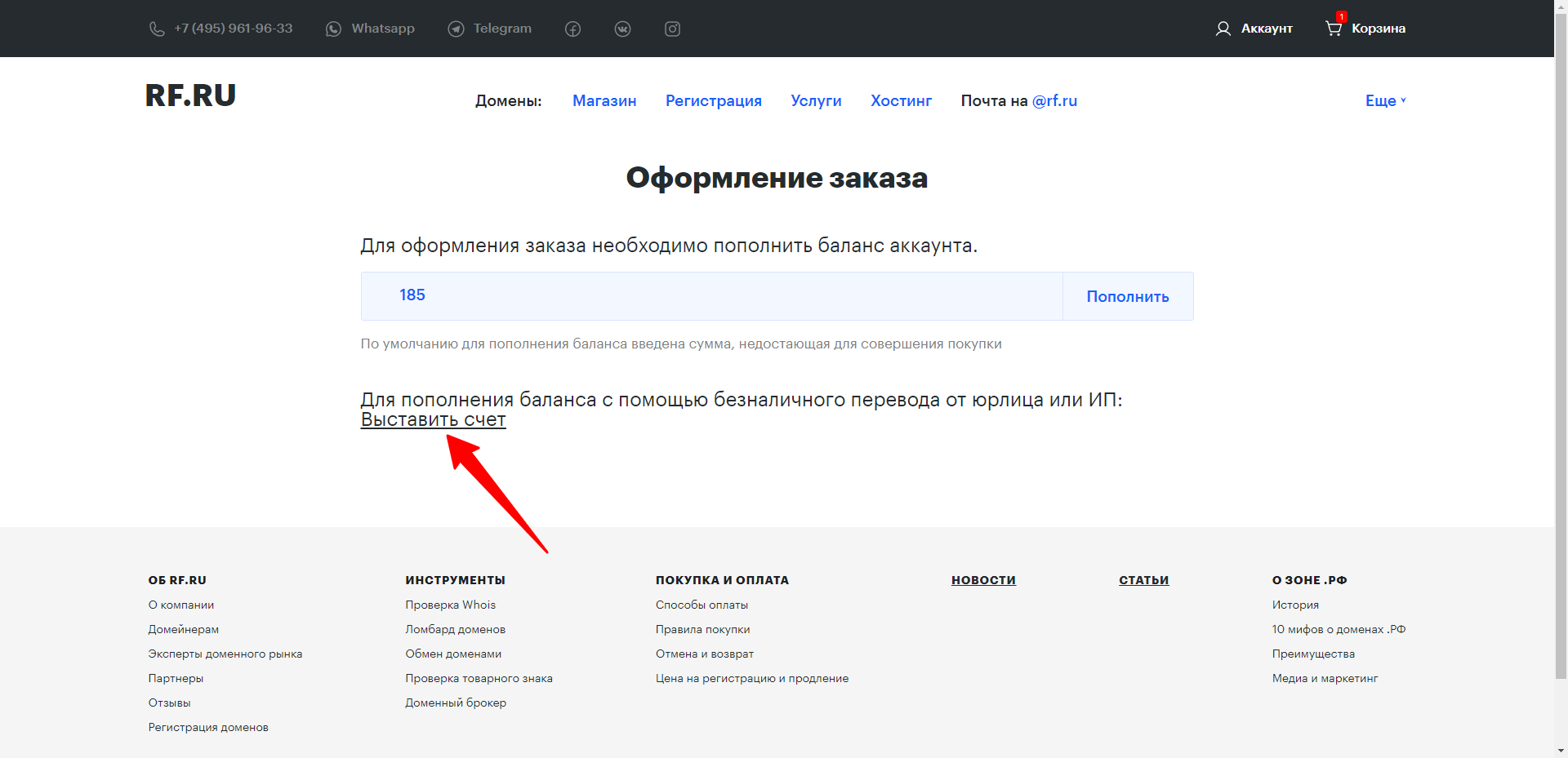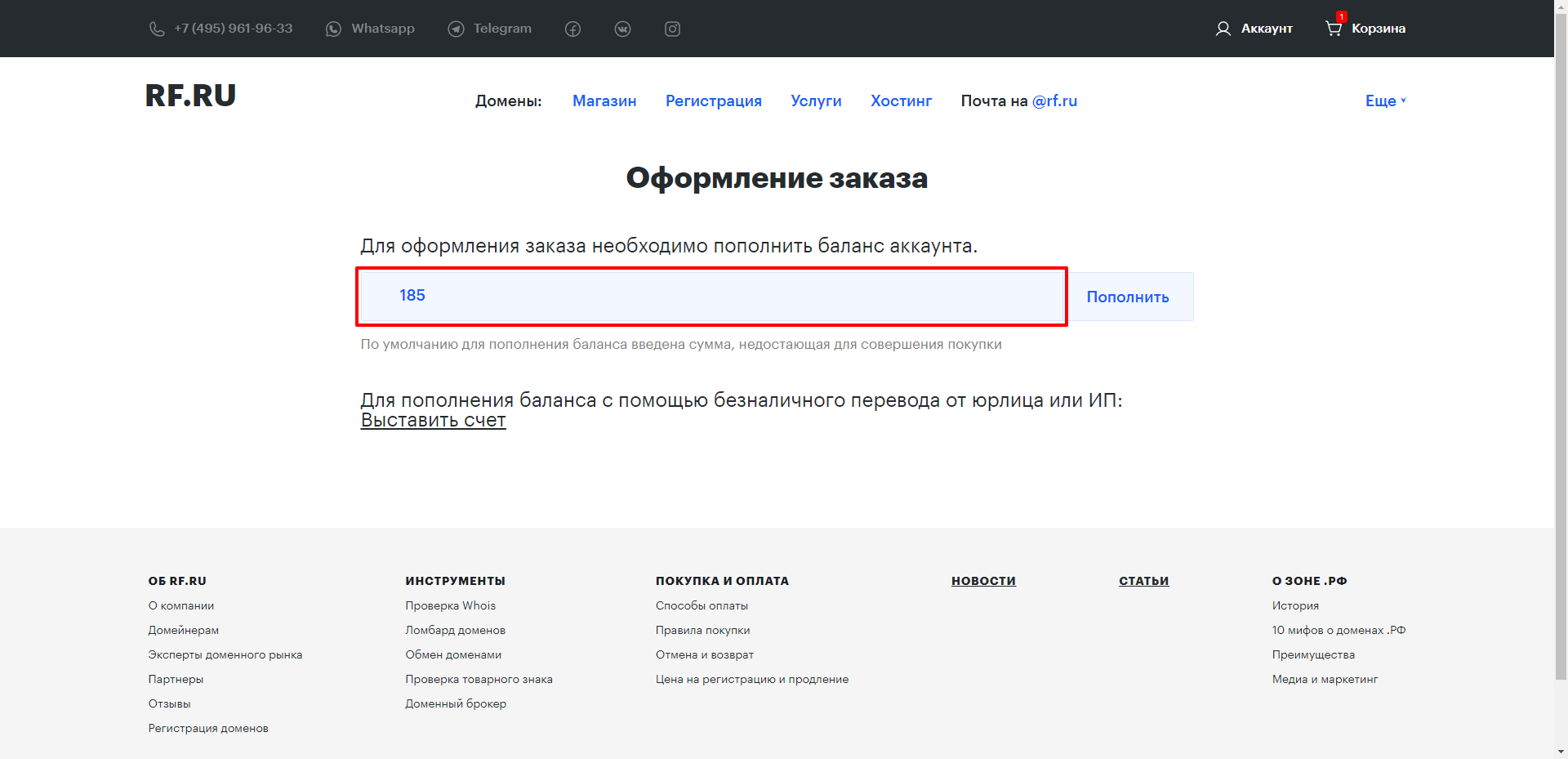 - Если на балансе аккаунта уже есть необходимая сумма или бОльшая, средства сразу будут списаны без выставления счета. Если же средств на балансе недостаточно, вы попадете на страницу Оформление заказа. В поле ввода будет указана сумма вашего заказа (стоимость услуги в корзине), при желании вы можете изменить ее вручную.