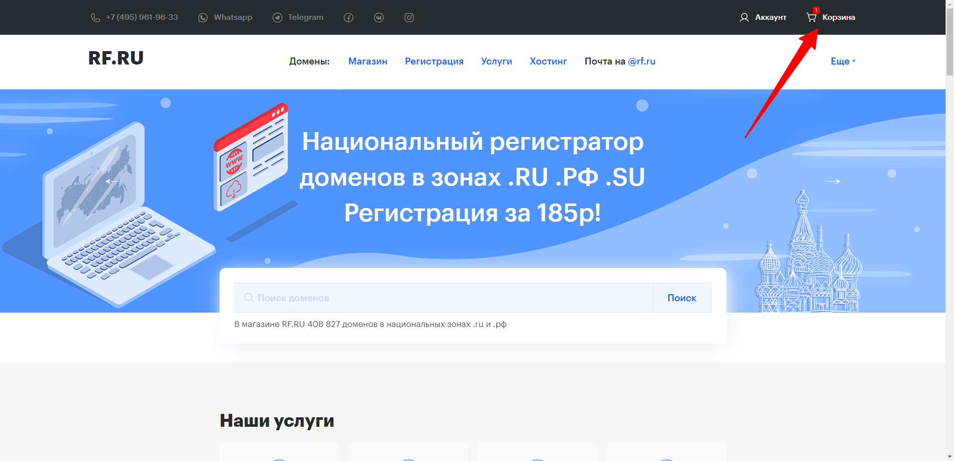 - На сайте RF.RU перейдите в Корзину, куда уже добавлена нужная вам услуга (или услуги).