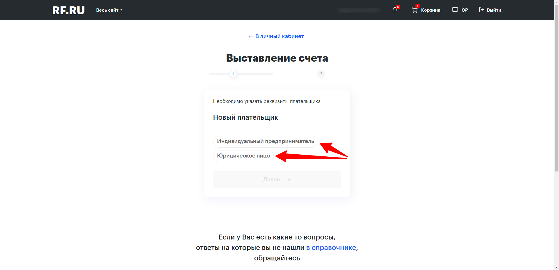 - На странице первого шага Выставления счета выберите кем является плательщик - Индивидуальным предпринимателем или Юридическим лицом.